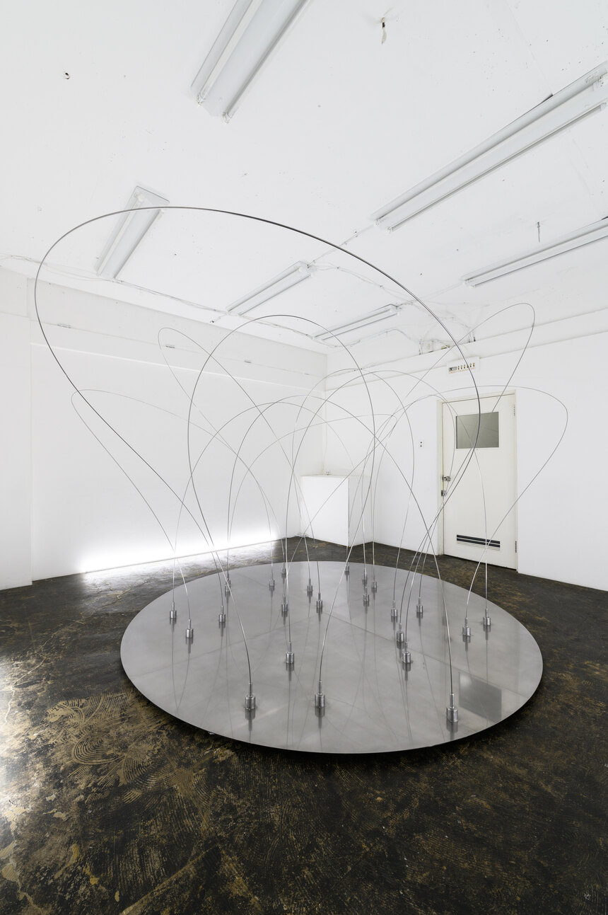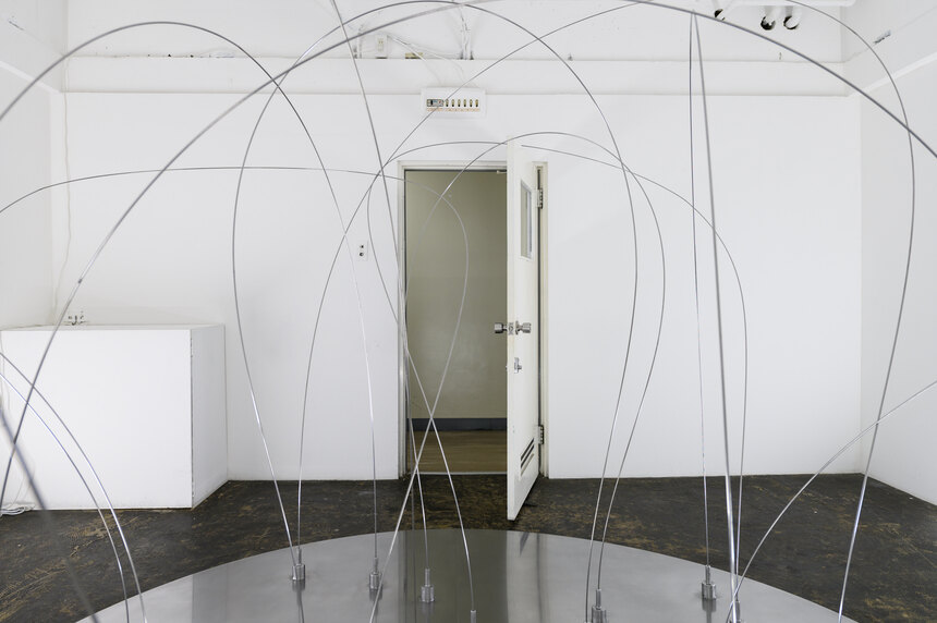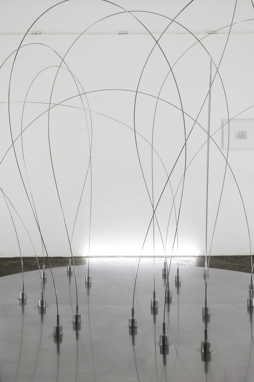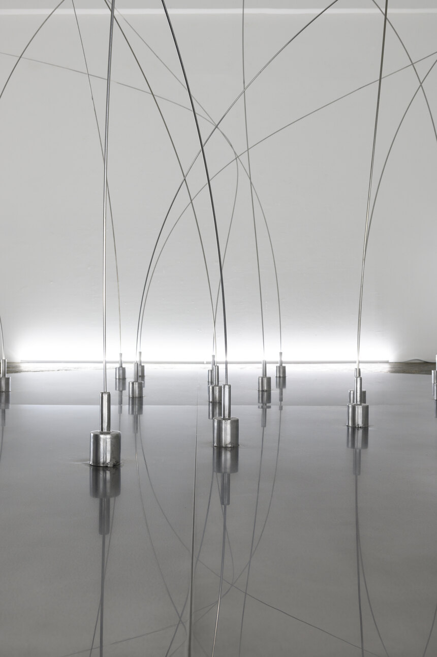 I first drew a figure composed of twelve arcs on paper, then prepared twelve iron cubes and twelve iron cylinders, each numbered from 1 to 12 on the reverse side, and scattered them across the diagram. Where the numbers overlapped, I connected the points with lines, using this chance-generated map as the basis for the sculpture. The dispersed iron pieces resembled a map, while the resulting structure evoked an island.