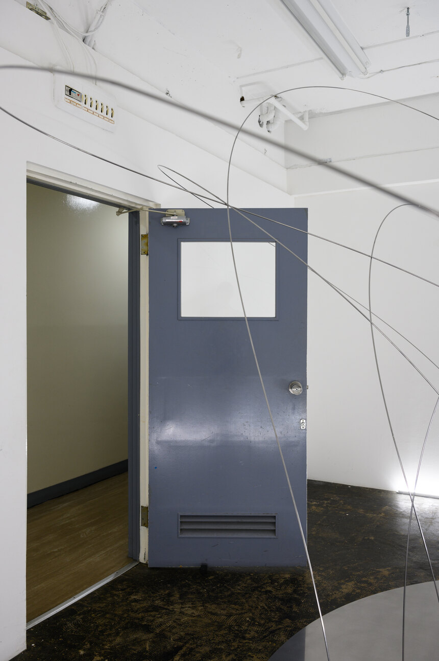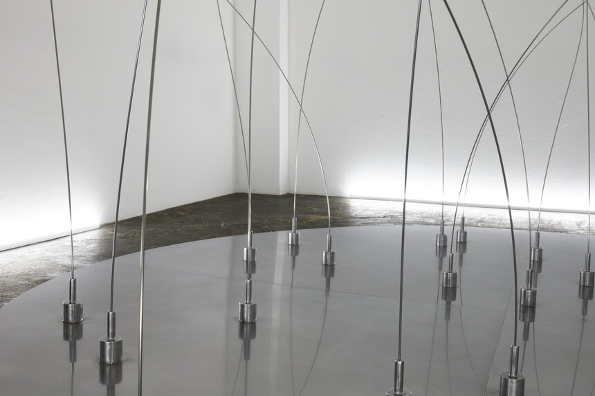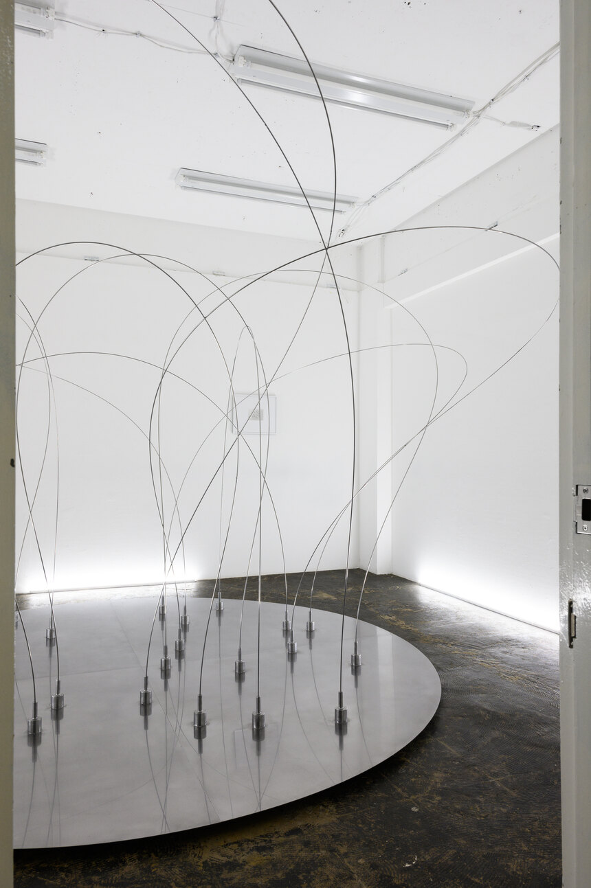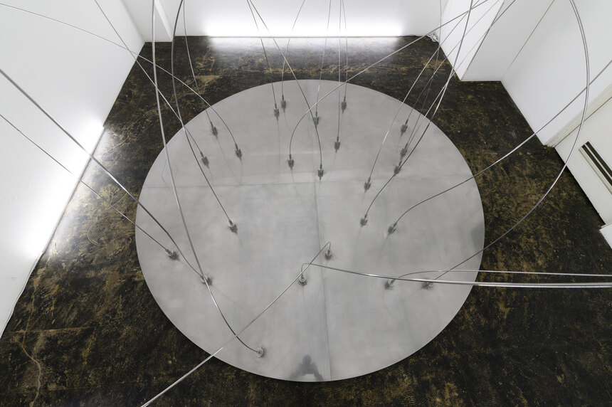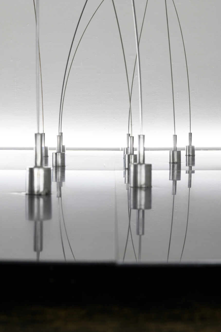 I first drew a figure composed of twelve arcs on paper, then prepared twelve iron cubes and twelve iron cylinders, each numbered from 1 to 12 on the reverse side, and scattered them across the diagram. Where the numbers overlapped, I connected the points with lines, using this chance-generated map as the basis for the sculpture. The dispersed iron pieces resembled a map, while the resulting structure evoked an island.