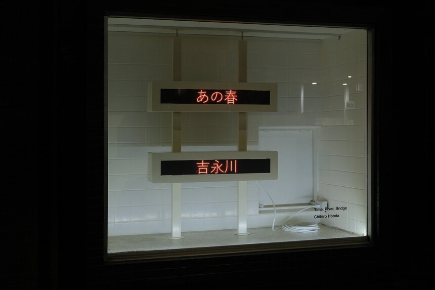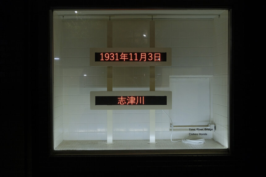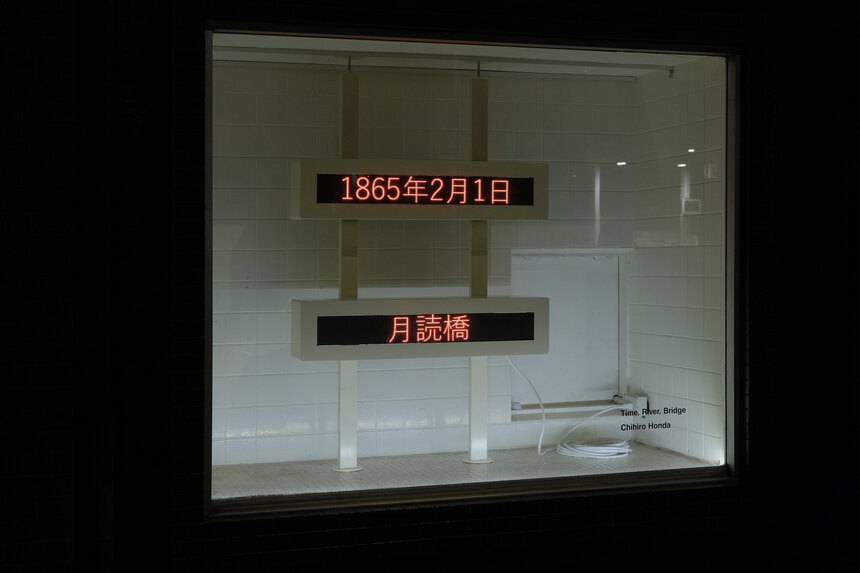 This series uses electronic billboards installed in street-facing windows, working with words as material. Randomized combinations of text are continuously displayed, drawing on place names specific to each exhibition site. In Kyoto, these included the names of rivers; in Ebisu, Tokyo, the names of slopes, roads, and bridges. These are paired with fragments of time, such as dates of historically significant events connected to each location.