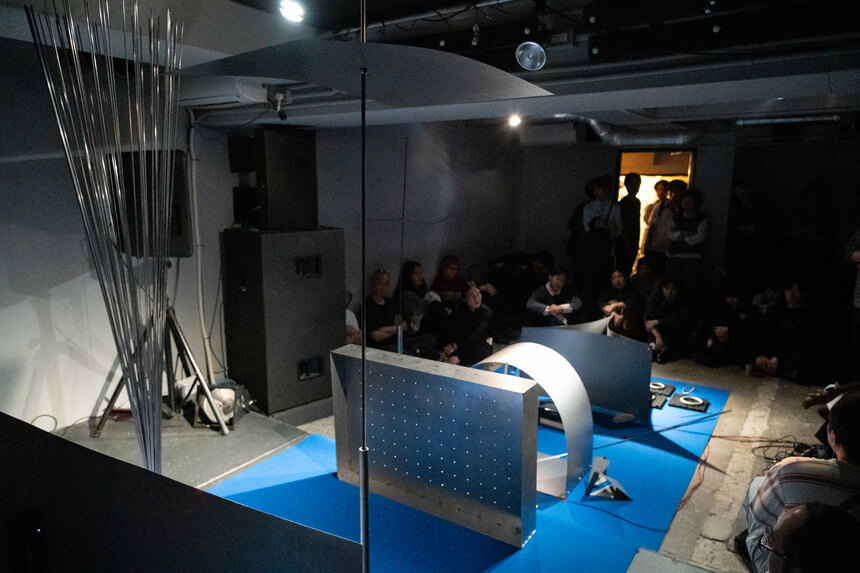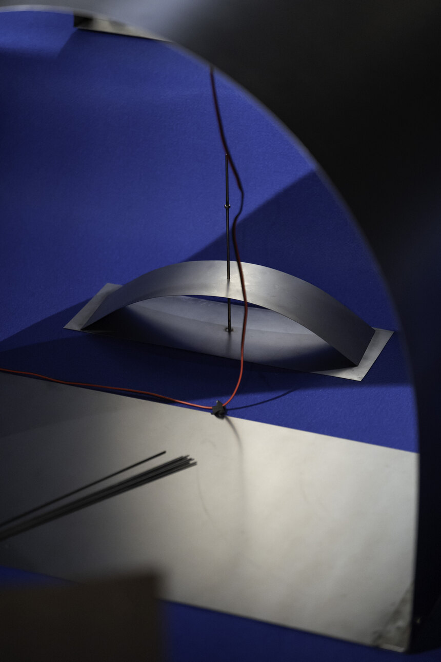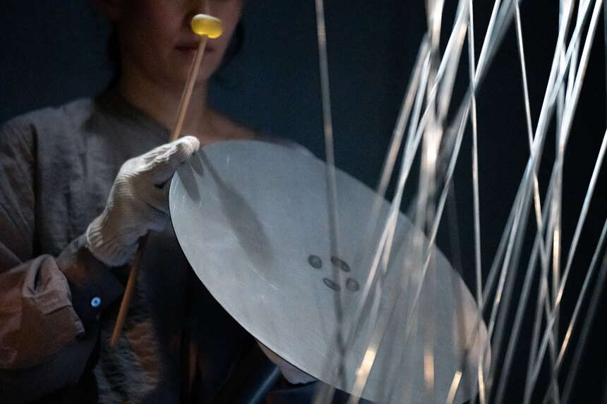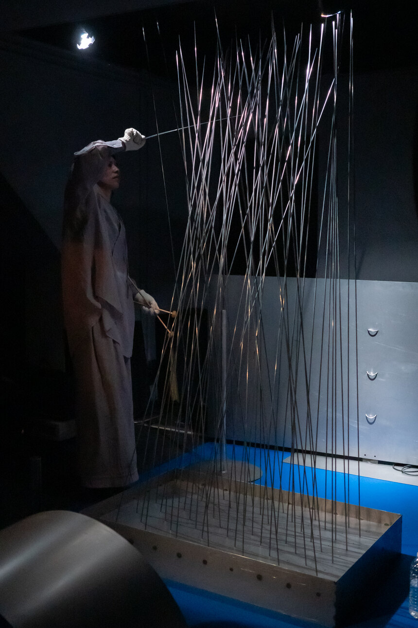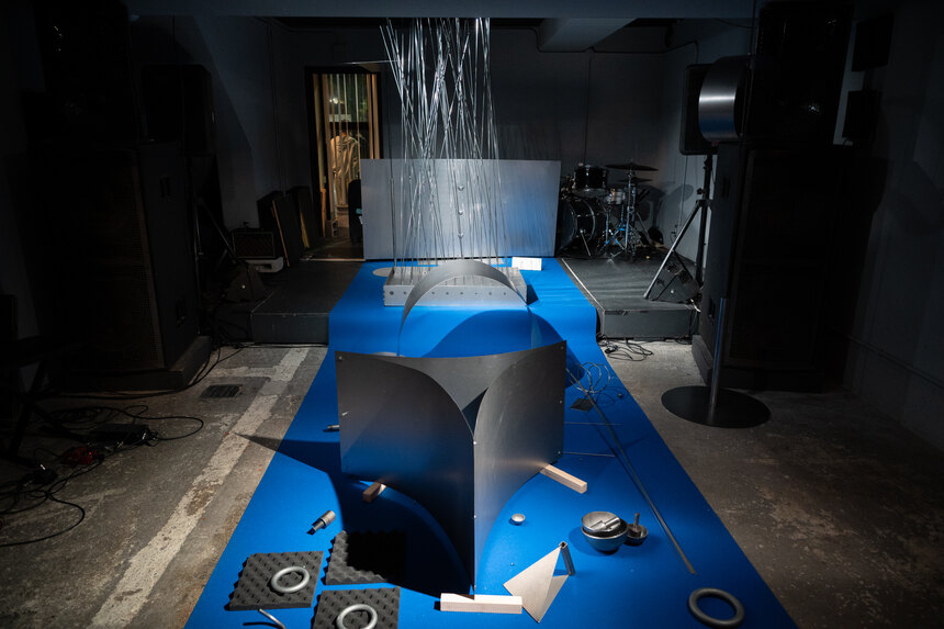 Constructed from thin sheets of iron, assembled like folded paper in a manner reminiscent of origami play, the structure evolves into a sound sculpture through performance.